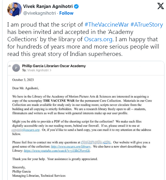 Oscars library invites Vivek Agnihotri The Vaccine War True Story script for Academy collections, Vivek Agnihotri hails the achievement of the Indian superheroes. The Film is Based on True Story of Indian Scientists.
